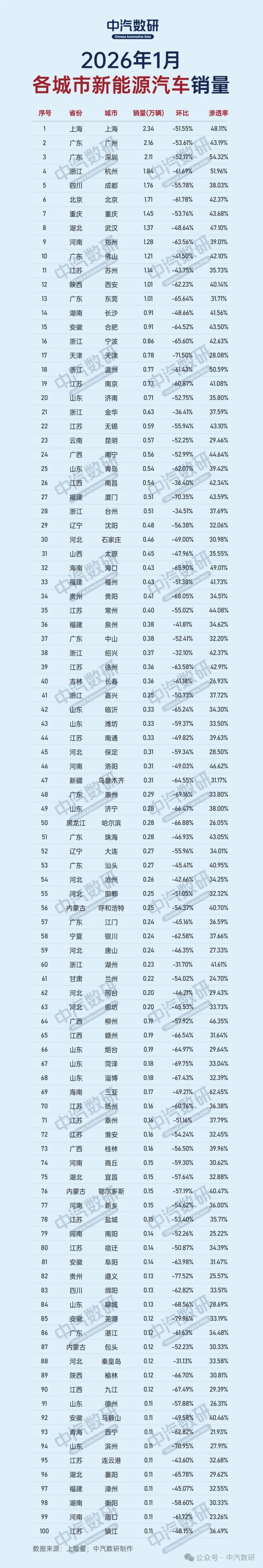 【CNMO科技消息】2月28日,中汽数研发布了2026年1月新能源汽车城市销量数据。数据显示,当月国内新能源乘用车终端销量仅为56.5万辆,环比暴跌57.6%,同比下滑19.7%,狭义乘用车市场渗透率也随之回落至36.2%。